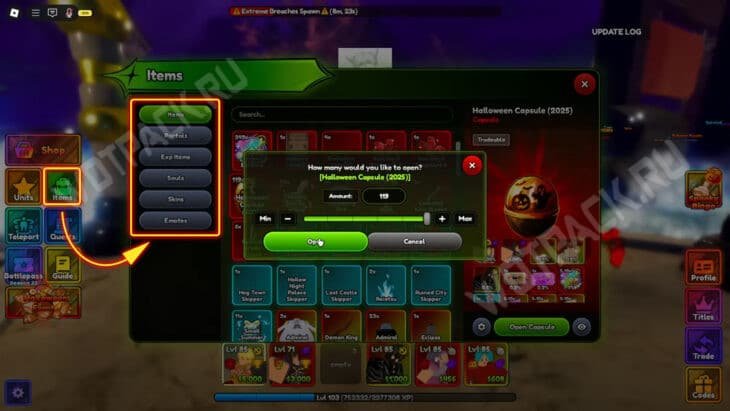 Após inserir o código promocional correto, as recompensas gratuitas serão creditadas automaticamente em seu perfil de jogador. Para verificar seus itens, clique no ícone verde “Itens” com uma mochila no painel esquerdo. Alguns recursos consumíveis podem não ser exibidos se forem destinados ao uso na loja ou em outras construções temáticas.